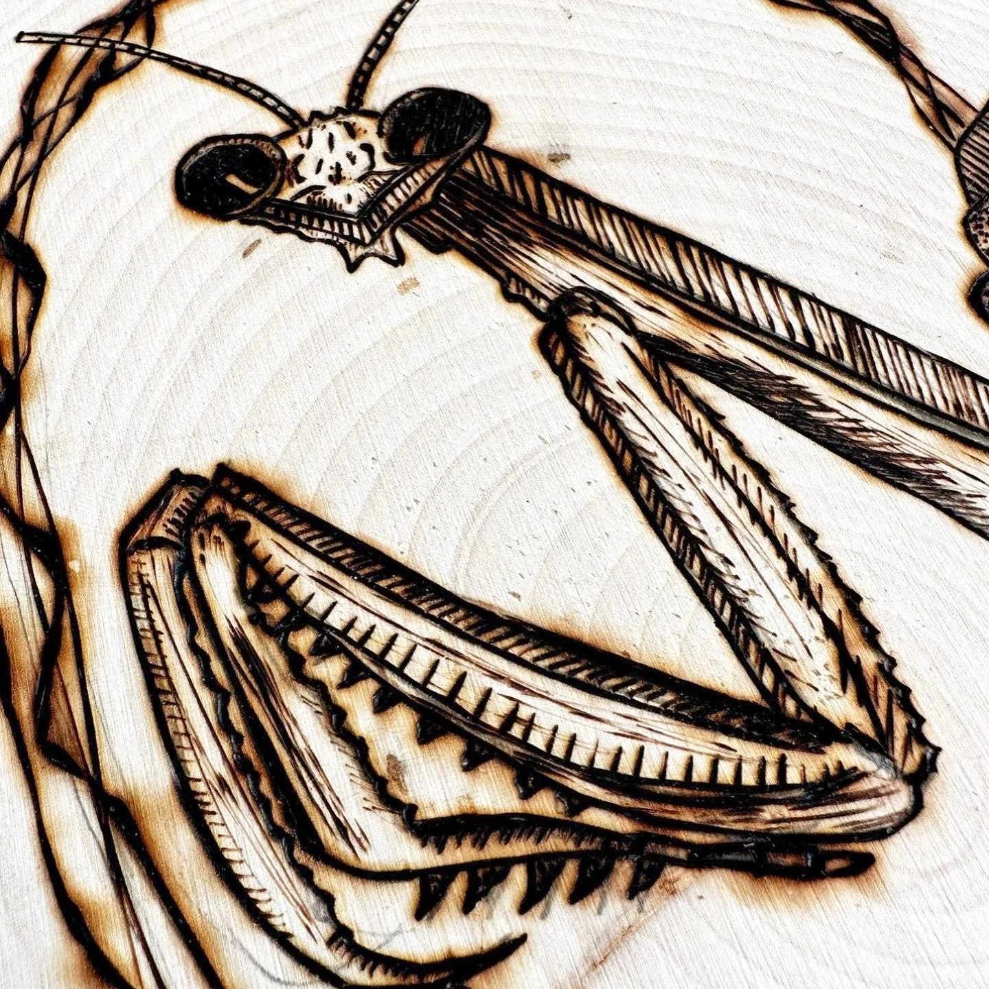 Using a precious hand-me-down wood burning tool from her Grandpa, Elisabeth creates a variety of wood burned pieces of art. Chartcuterie boards, pet portraits, and custom cutting boards are a few items frequently commissioned. E also creates her own wood burned art pieces inspired by insects and mysticism.